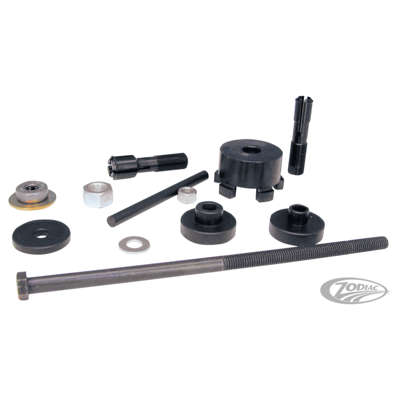 S'utilise pour poser et déposer les nouveaux roulements de roue scellés comme utilisés sur tous les modèles Harley-Davidson et Buell avec ABS ou non de 2000 au present ainsi qu'indian de 2014 au présent, sans abîmer les roues. Le kit s'utilise avec les axes en 3/4'' et 1'' de diamètre. Les kits fournis avant 2007 n'avaient pas l'outil pour axes en 25 mm qui doit être commandé séparément. Pour les roues coulées 5- et 7-goujons de 2010 au présent CVO et 2014 au présent Touring une plaque de support d'outil doivent être commandés séparément. Pour les 2014 au présent Indian il faut commander séparément un protecteur de moyeu.