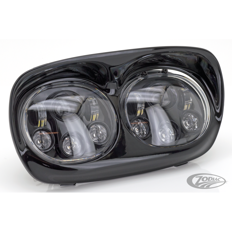 Optique de phare complète avec deux double faisceaux Leds CREE. Donne un faisceau large et supérieur en contraste et couleurs dans toutes les conditions routières. Reste fort indépendamment des conditions de la batterie. Pour 2001 à 2013 Road Glide, peut être monté sur les 1998 à 2000 si les connexions sont modifiées. Homologué DOT.