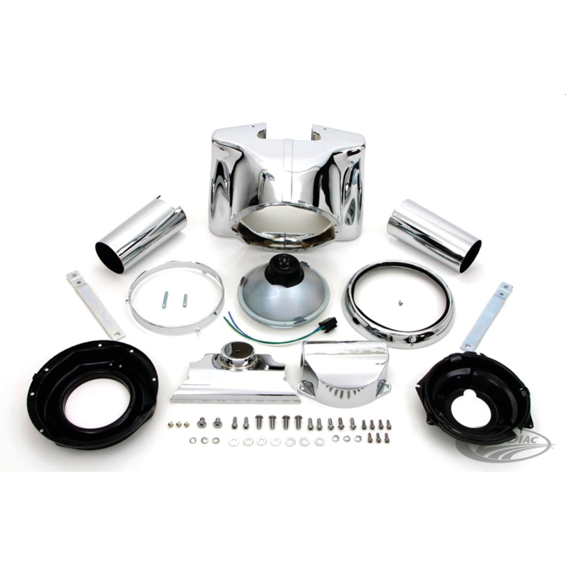 Convertissez votre Softail ou votre Fat Boy avec phares de série à l'ancien modèle de cuvelage de phares avec ce kit complet. Il comprend le cuvelage de deux pièces en aluminium chromé avec tous les étriers dont vous aurez besoin, le corps de et le matériel de phares, les couvercles de tubes chromés ainsi que les couvercles pour Tés inférieurs et pour riser de guidon. Ce kit élégant se boulonne directement sur tés OEM sur tous les modèles du Heritage Softail et Fat Boy 1986-2006 avec guidon de 1''. Les motos avec guidon de 1 1/4'', Fat Boy 2007-2017 et 2009-2017 Softail requièrent des modifications. Il existe un cerclage de phare optionnel qui allongera le look du phare.