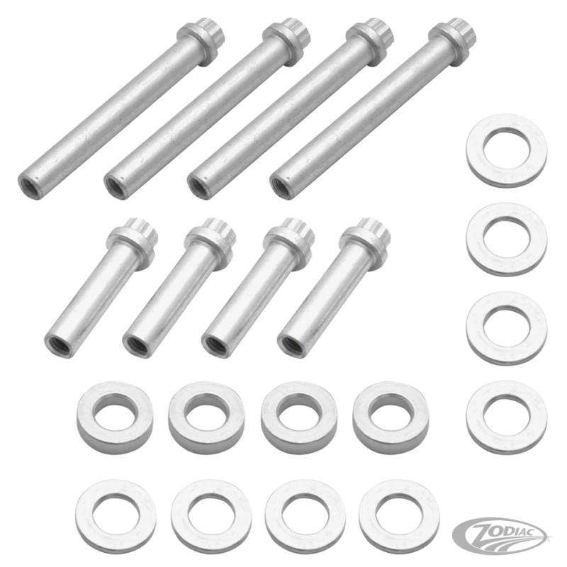 Kits complets comprenant quatre boulons courts et quatre longs à 12 pans et huit rondelles. Les rondelles ne sont pas utilisées d’origine sur les modèles récents, mais les kits pour derniers modèles S&S incluent ceux-ci pour une résistance accrue.