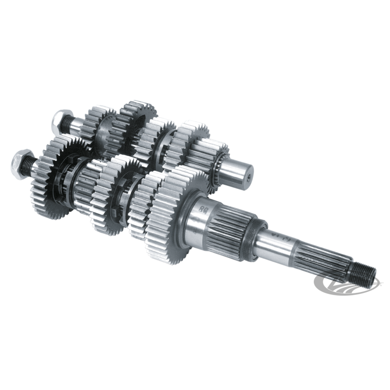 Ces jeux d’arbres et pignons utilisent le style "silencieux" des modèles 1994-2006. L'acier utilisé est de qualité 20CrMnT. Pignons et arbres sont trempés, ils ont une dureté de 58 a 60 Rockwells en surface et de 35 a 45 Rockwells au centre. Tous les pignons sont rodés après traitement pour obtenir une surface de dents lisse qui garantit une transmission silencieuse et sans problème pendant de très nombreux kilomètres. Le kit contient tous les pignons, roulements à aiguilles, rondelles de butée, circlips, les écrous de trappe, les arbres primaire et secondaire.