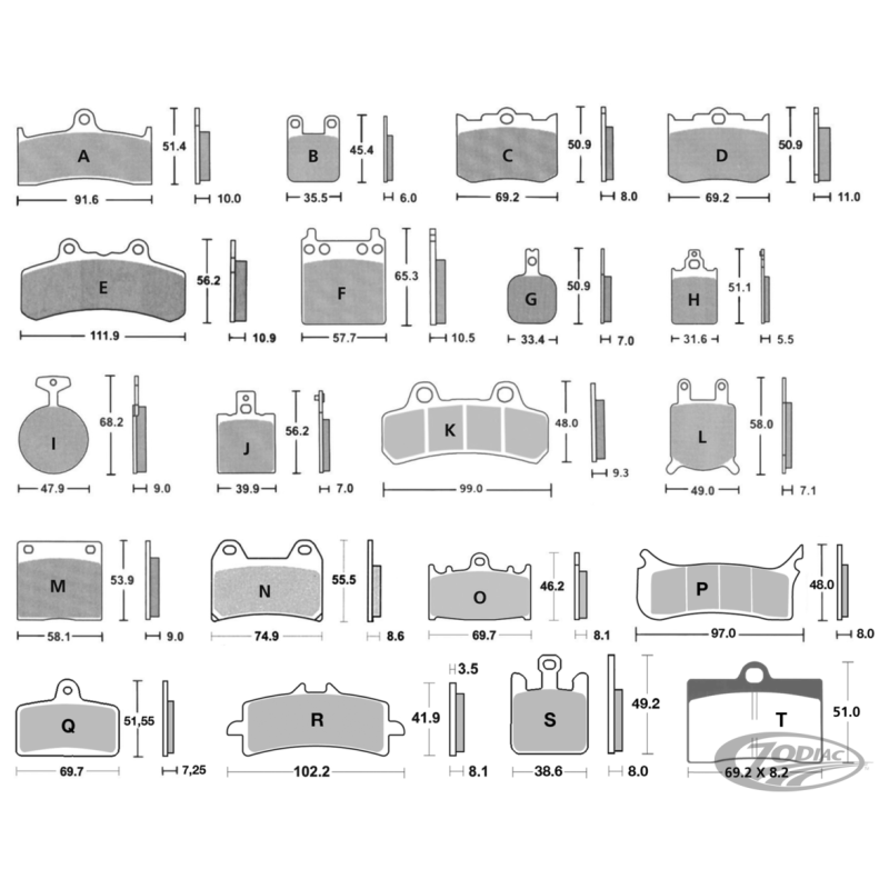 La plupart des Harley riders améliorent le freinage de leur moto avec des étriers after market. Ce tableau vous aidera à trouver facilement ce dont vous avez besoin. Nous proposons des plaquettes d'origine pour les étriers PM et GMA mais aussi des EBC mix Organique/Aramide, HH métalique mélange cuivre, et les V Semi-métaliques ainsi que les plaquettes SBS métal/Céramique et Carbon Tech.Ces plaquettes sont homologuées CEE, DOT et R.F.A. et sont réputées pour leurs performances en toutes circonstances, elles ont aussi un indicateur d'usure. Les plaquettes EBC sont celles des PM d'origine. La marque et le modèle des étriers sont mentionnés mais ces plaquettes sont aussi utilisées par de nombreuses autres marques d'étriers. Les dimensions et dessins vous aideront à trouver.