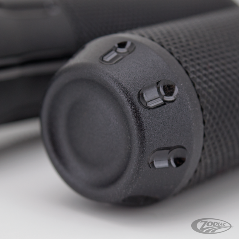 Ces poignées en aluminium usiné sont recouvertes de caoutchouc pour ajouter la touche finale à votre moto. Disponible pour câbles et tirages électriques en chromé, chromé grenaillé, noir avec des coupes claires, ou l'exclusif Zodiac noir 2 tons, une finition qui correspond parfaitement avec la finition noire du moteur de Harley.