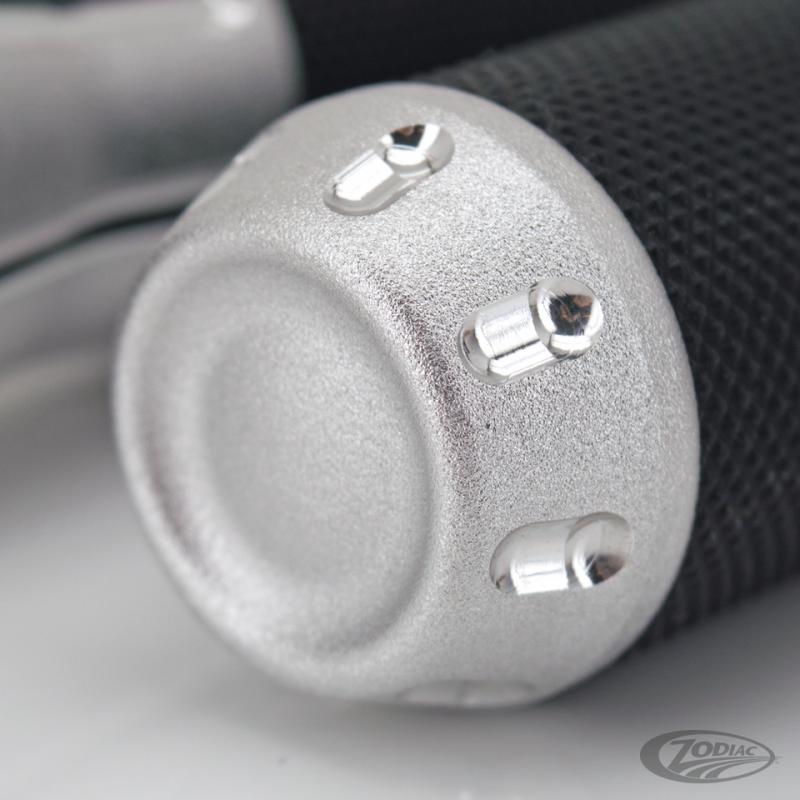 Ces poignées en aluminium usiné sont recouvertes de caoutchouc pour ajouter la touche finale à votre moto. Disponible pour câbles et tirages électriques en chromé, chromé grenaillé, noir avec des coupes claires, ou l'exclusif Zodiac noir 2 tons, une finition qui correspond parfaitement avec la finition noire du moteur de Harley.