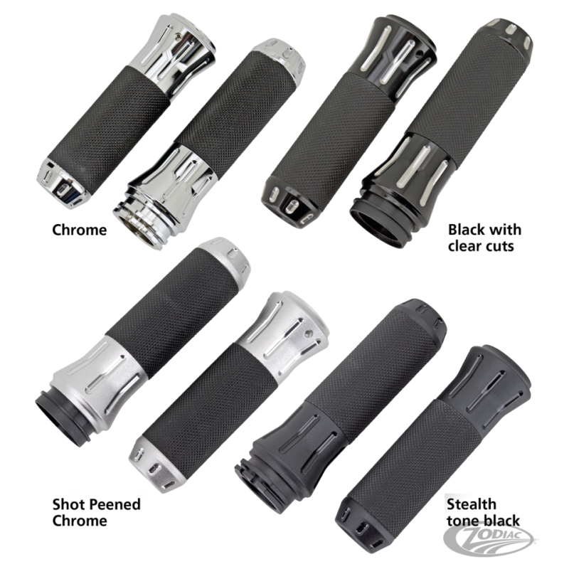 Ces poignées en aluminium usiné sont recouvertes de caoutchouc pour ajouter la touche finale à votre moto. Disponible pour câbles et tirages électriques en chromé, chromé grenaillé, noir avec des coupes claires, ou l'exclusif Zodiac noir 2 tons, une finition qui correspond parfaitement avec la finition noire du moteur de Harley.