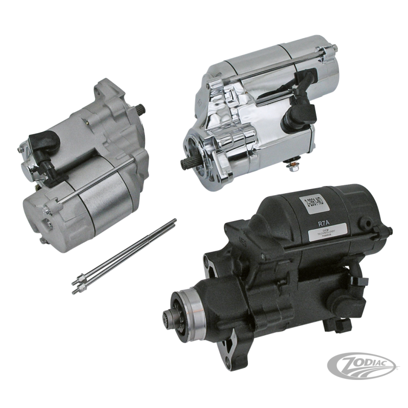 Ces démarreurs Denso style OSGR sont plus puissants que ceux d'origine et sont entièrement uniquement avec des pièces neuves. Ils sont fabriqués selon des standards de haute qualité et ont subi un contrôle qualité avant de quitter l'usine. Leurs pignons intermédiares sont traités et ils ont une garantie à vie sur leur roue libre de démarreur quand ils sont utilisés sur un moteur d'origine. Disponible pour Big Twin 1989 au présent en finition aluminium, noire ou chromée et en versions 1.4 kW et 1.8 kW remplacer les démarreurs de 1.2 kW d'origine. Version aluminium sont livrées avec des caches solénoides et des vis chromées.