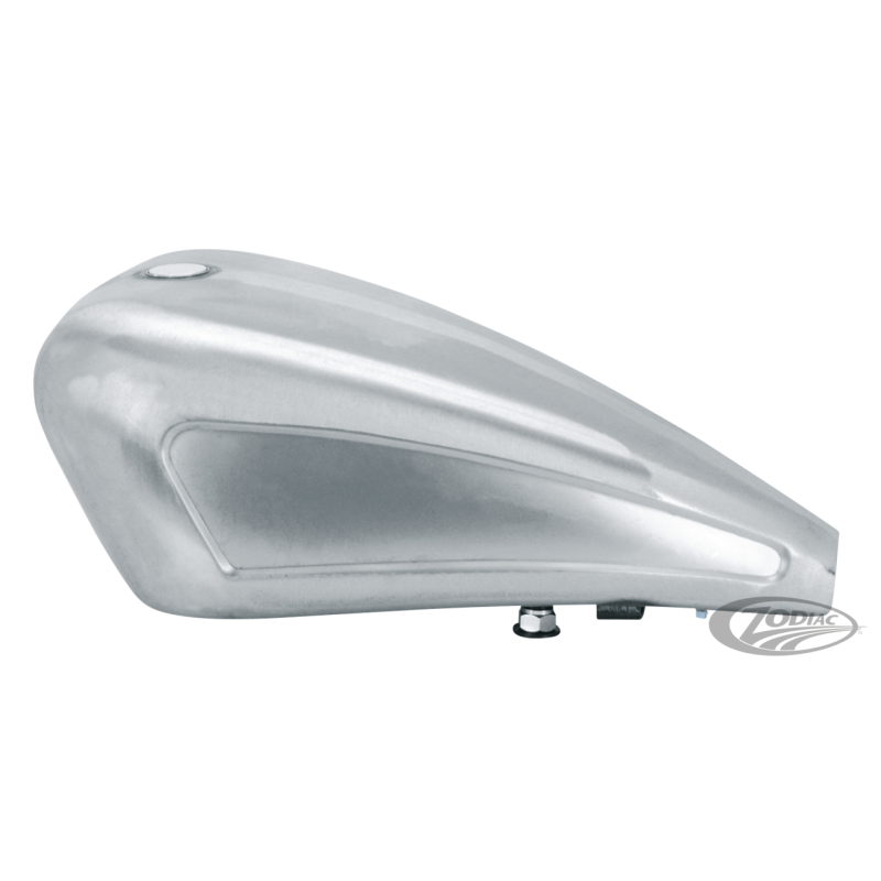 Ces réservoirs ont un très beau design et une apparence bien lisse qui améliorera les lignes de n'importe quel chopper. Disponible pour des cadres avec rallongement de 4" ou 6" des tubes inférieurs et 3" minimum du tube supérieur. "Tunnel" ira parfaitement avec les tubes supérieurs de cadre jusqu'à 2" dia. Réservoirs sont livrés avec des pattes à souder qui sont lissées sous le réservoir pour donner un look parfait. L'arrière du réservoir est fileté en 1/8"-27 NPT pour la durite de jonction. S'utilise avec des robinets d'essence 13/16".