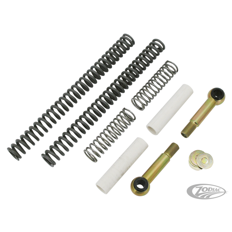 Tout ce dont vous avez besoin pour rabaisser l'avant et l'arrière de votre Softail en seul package. Le système de rabaissement avant ne nécessite pas de de démonter la fourche et peut s'intaller en seulement 20 minutes avec la fourche toujours sur la moto. Rabaisser l'arrière se fait en changeant les tiges d'amortisseur d'origine par celles qui sont fournies. Instructions d' installation pas à pas fournies. Les Kits rabaissent votre Softail de 2" (5 cm) à l'avant et l'arrière.