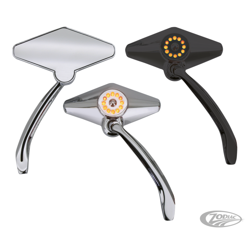 Rétrovieurs Triad qui disposent d'une forme unique. Le miroir fait 5,6" (14cm) de large et 3,1" (8cm) de haut. La tige a des inserts en caoutchouc qui couvrent aussi le câblage des LEDs claires qui s'allume en orange. Ceux à simple fonction permettent de faire clignotants et ceux à double fonction font à la fois feux et clignotants. Vendus par paire.