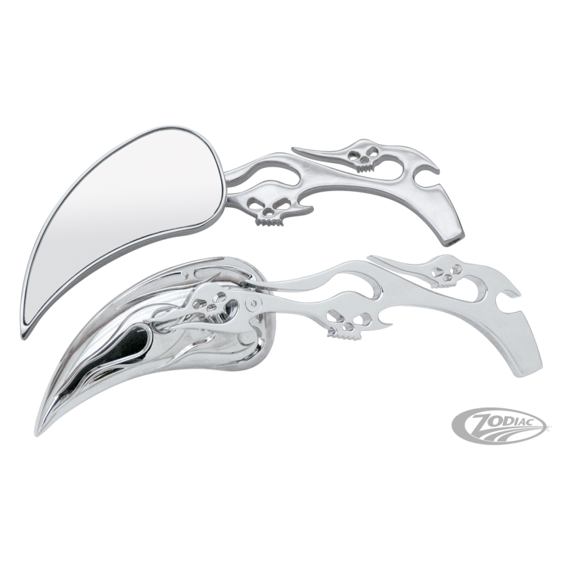 Ces rétroviseurs Meteor mesurent 5 3/8" de large et 2 3/8" de haut avec des flammes au dos. Le mécanisme de réglage renforcé avec boule garde le rétroviseur dans sa position même dans les pires conditions. Les tiges de 7 1/2" de long ont des crânes. Ils vont parfaitement avec nos tiges de sélecteur avec crânes (ZPN110073, 110077 et 110081). Ce jeu de rétroviseurs chromés remplacera avantageusement la plupart des rétroviseurs, visserie de montage incluse. Vendus en jeu gauche et droit.