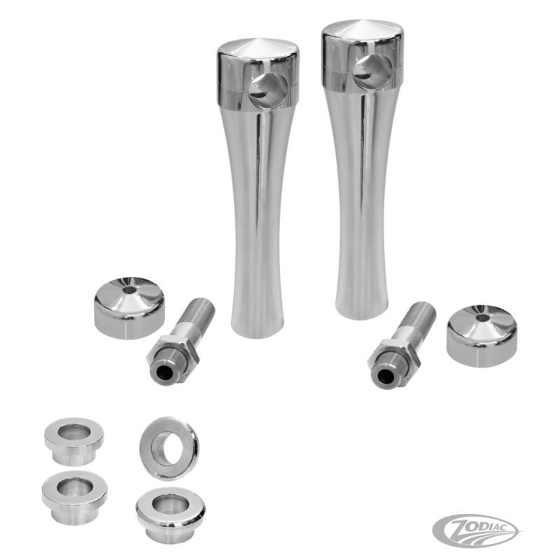 Les risers Rebuffini Naus avec fils cachés permettent de cacher les fils des commandes et de donner ainsi un vrai look custom pour les guidons en 1" de diamètre. Ces risers se montent directement dans le Té supérieur sans utiliser les silent-bloc ou sinon avec les silent blocs en combinaison avec le kit de réducteurs. Les couvercles ont des vis cachées pour améliorer l'apparence.