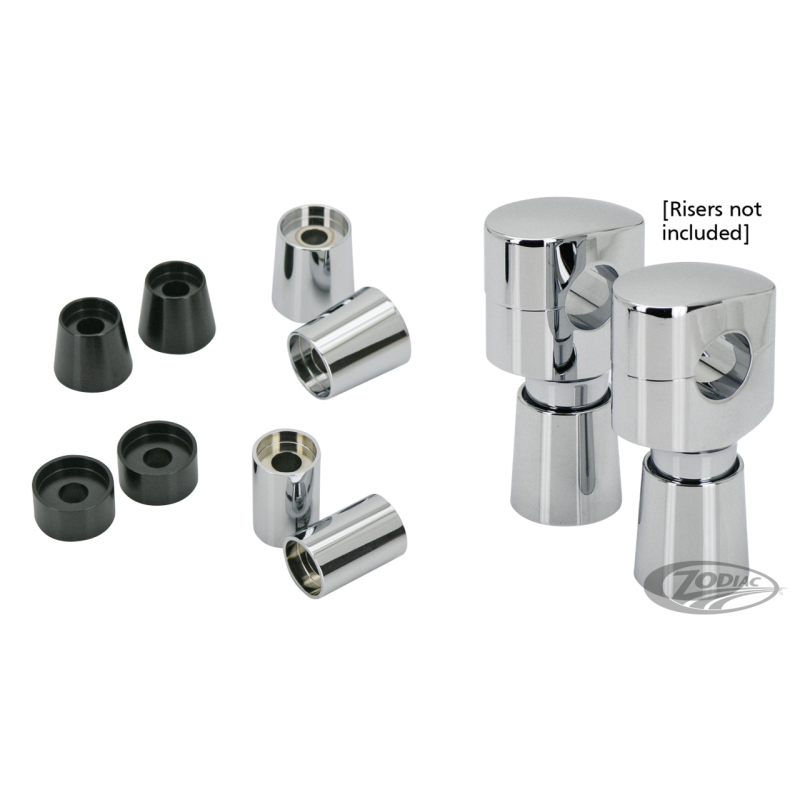 Ces extensions en aluminium usiné sont conçues pour accroître la hauteur de nos risers Fusion ainsi que de la plupart des guidons T-Bar qui font un 1 "ou 1 1/4" de diamètre. Elles disposent d'un évidement dans le haut pour tenir votre riser T-Bar exactement dans la bonne position et sont disponibles en style droit ou conique. Les vis de risers rallongées doivent être commandés séparément. Les extensions sont vendues par 2 avec finition chromée ou noire.