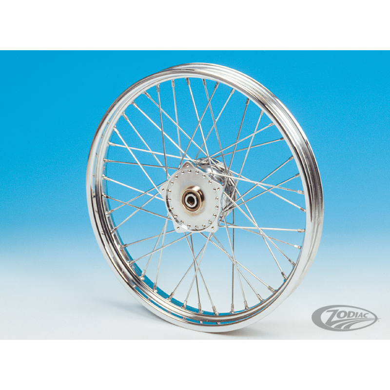 Il s'agit d'une sélection de roues de rechange de série ou personnalisées pour les modèles Sportster et FX avec fourche Narrow Glide de 1974-1977 (les FXS et XLCR de 1977 exceptes). Ces ensembles se vendent avec des rayons soit chromés, soit d'acier inoxydable poli déjà montés à un moyeu chromé et à une jante chromée à base creuse de 19" ou de 21". Chaque roue s'accompagne d'une entretoise d'essieu, de joints d'étanchéité et de paliers dont le jeu est déjà établi.