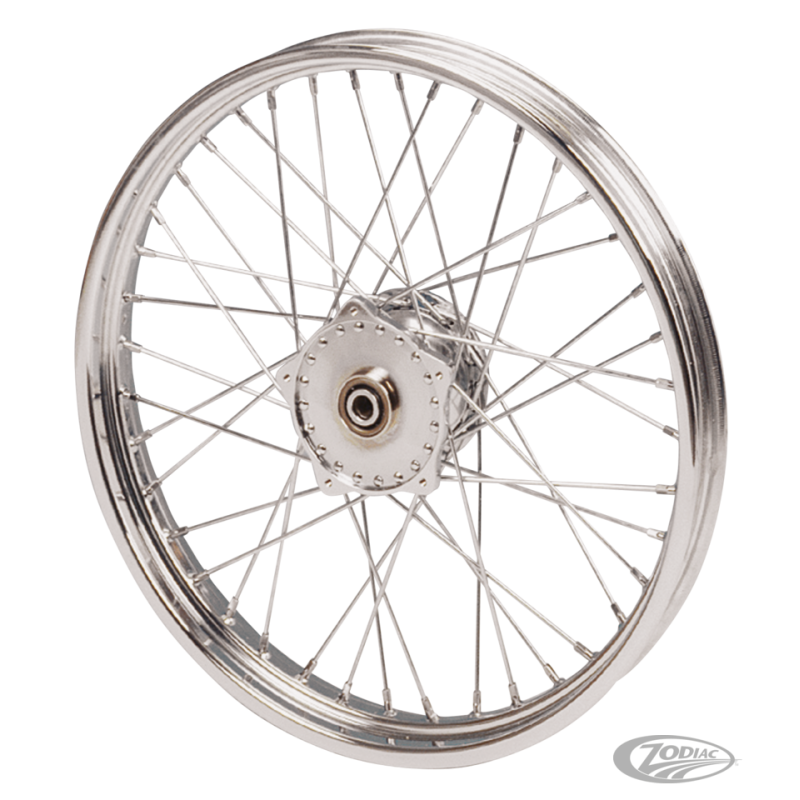Il s'agit d'une sélection de roues de rechange de série ou personnalisées pour les modèles Sportster et FX avec fourche Narrow Glide de 1974-1977 (les FXS et XLCR de 1977 exceptes). Ces ensembles se vendent avec des rayons soit chromés, soit d'acier inoxydable poli déjà montés à un moyeu chromé et à une jante chromée à base creuse de 19" ou de 21". Chaque roue s'accompagne d'une entretoise d'essieu, de joints d'étanchéité et de paliers dont le jeu est déjà établi.