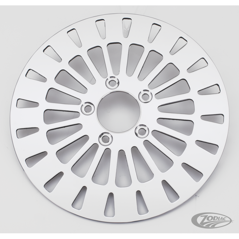 Ces roues avec 50 gros rayons, aussi connues sous le nom de "Fat Daddy" sont fabriquées aux USA et utilisent un rayonnage radial avec des rayons droits de 3/8" (9.5mm) de diamètre en inox qui sont polis ou noirs avec des têtes de rayon custom, moyeux usinés en aluminium et jantes chromées. Toutes les jantes sauf celles en 19x2.15" et 21x2.15" sont étanches pour pouvoir être utilisées avec des pneus Tubeless. Les valves Tubeless ne sont pas comprises. Les roues arrières de 4.25" de large vont sur la plupart des applications en modifiant juste les entretoises d'axe de roue et de disque/poulies si nécessaire. Les jantes plus larges que celles d'origine doivent être utilisées avec des bras oscillants larges et déports que vous trouverez ailleurs dans le catalogue Zodiac Bikers Book. Les roues avant pour Softail sont avec simple bride pour simple disque. Toutes les autres roues sont à double bride pour double disque ou disque et poulie pour l'arrière.