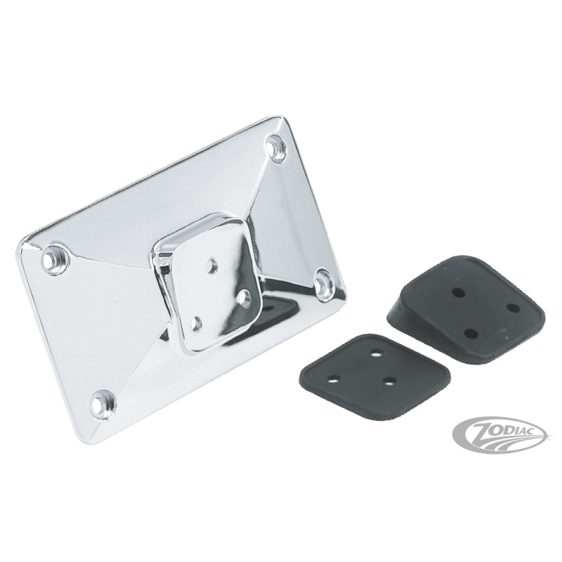 Ce support de plaque d'immatriculation chromé, bien ajusté et monobloc remplace le support vertical multibloc et l'équerre du garde-boue arrière. Deux entretoises de caoutchouc empêchent la vibration de la plaque d'immatriculation et vous permettent de tailler le support selon le profil du garde-boue. Vous pouvez le monter directement sur les trous habituels de tous les garde-boue arrières de 1955 jusqu'au présent (les FXWG et FXST exceptés). Tout le matériel de montage est inclus.