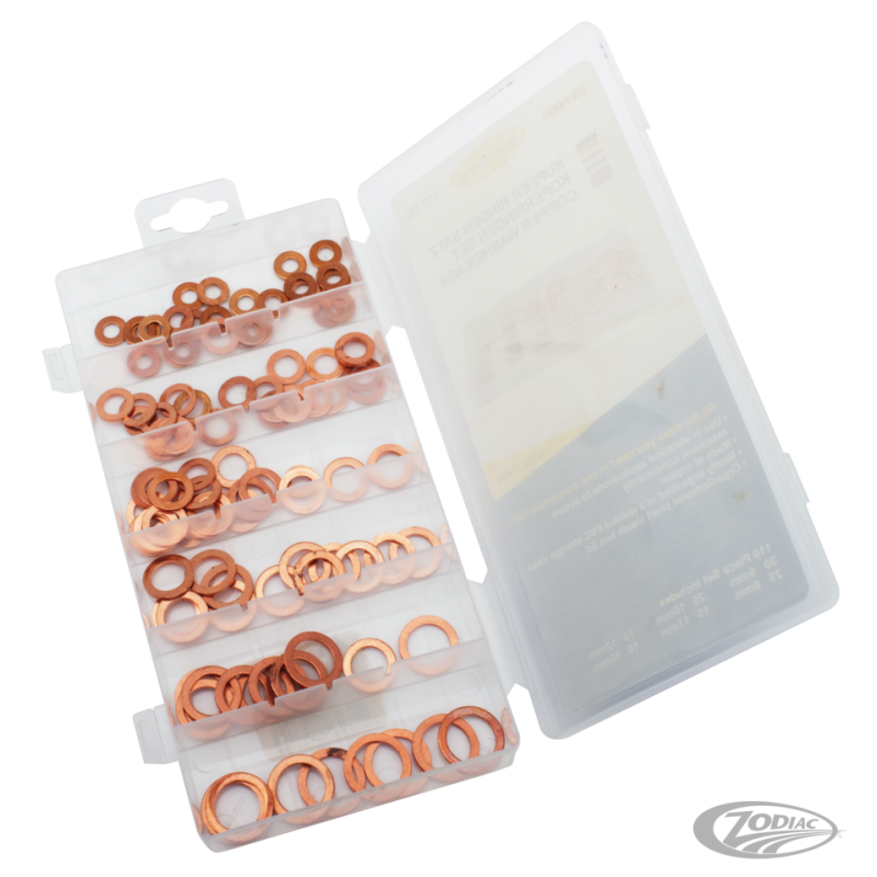 Plateau d'assortiment de 110 pièces de rondelles en cuivre de taille commune. Le plateau comprend: 30x6mm, 25x8mm, 20x10mm, 15x11mm, 10x12mm et 10x16mm.